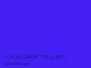 YUV 66.046,87.731,0.837 Color is a normal indigo color and the nearest color is Han Purple #5218fa. Hex code #431ff4 and RGB value is rgb(67,31,244). In RGB color space, this color is composed of 26% red, 12% green, 96% blue, In CMYK color space, this color is composed of 73% cyan, 87% magenta, 0% yellow , 4% black , In HSL color space, this color has a hue angle of 250° , 91% saturation and 54% lightness.