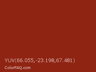 YUV 66.055,-23.198,67.481 Color is a normal red color and the nearest color is Kobe #882d17. Hex code #8f2413 and RGB value is rgb(143,36,19). In RGB color space, this color is composed of 56% red, 14% green, 7% blue, In CMYK color space, this color is composed of 0% cyan, 75% magenta, 87% yellow , 44% black , In HSL color space, this color has a hue angle of 8° , 77% saturation and 32% lightness.
