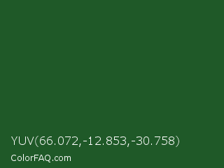 YUV 66.072,-12.853,-30.758 Color is a dark green color and the nearest color is Cal Poly Pomona Green #1e4d2b. Hex code #1f5928 and RGB value is rgb(31,89,40). In RGB color space, this color is composed of 12% red, 35% green, 16% blue, In CMYK color space, this color is composed of 65% cyan, 0% magenta, 55% yellow , 65% black , In HSL color space, this color has a hue angle of 129° , 48% saturation and 24% lightness.