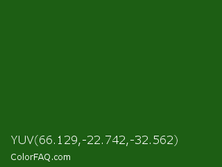 YUV 66.129,-22.742,-32.562 Color is a very dark green color and the nearest color is Lincoln Green #195905. Hex code #1d5e14 and RGB value is rgb(29,94,20). In RGB color space, this color is composed of 11% red, 37% green, 8% blue, In CMYK color space, this color is composed of 69% cyan, 0% magenta, 79% yellow , 63% black , In HSL color space, this color has a hue angle of 113° , 65% saturation and 22% lightness.
