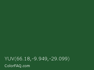 YUV 66.18,-9.949,-29.099 Color is a dark green color and the nearest color is Cal Poly Pomona Green #1e4d2b. Hex code #21572e and RGB value is rgb(33,87,46). In RGB color space, this color is composed of 13% red, 34% green, 18% blue, In CMYK color space, this color is composed of 62% cyan, 0% magenta, 47% yellow , 66% black , In HSL color space, this color has a hue angle of 134° , 45% saturation and 24% lightness.
