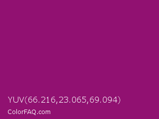 YUV 66.216,23.065,69.094 Color is a normal magenta color and the nearest color is Fresh Eggplant #990066. Hex code #911171 and RGB value is rgb(145,17,113). In RGB color space, this color is composed of 57% red, 7% green, 44% blue, In CMYK color space, this color is composed of 0% cyan, 88% magenta, 22% yellow , 43% black , In HSL color space, this color has a hue angle of 315° , 79% saturation and 32% lightness.
