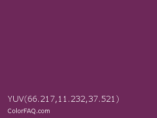 YUV 66.217,11.232,37.521 Color is a dark magenta color and the nearest color is Finn #692d54. Hex code #6d2859 and RGB value is rgb(109,40,89). In RGB color space, this color is composed of 43% red, 16% green, 35% blue, In CMYK color space, this color is composed of 0% cyan, 63% magenta, 18% yellow , 57% black , In HSL color space, this color has a hue angle of 317° , 46% saturation and 29% lightness.