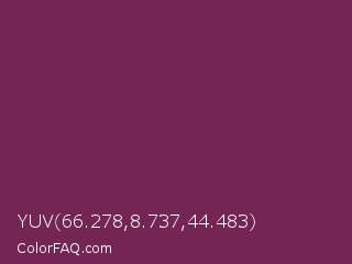 YUV 66.278,8.737,44.483 Color is a dark magenta color and the nearest color is Finn #692d54. Hex code #752554 and RGB value is rgb(117,37,84). In RGB color space, this color is composed of 46% red, 15% green, 33% blue, In CMYK color space, this color is composed of 0% cyan, 68% magenta, 28% yellow , 54% black , In HSL color space, this color has a hue angle of 325° , 52% saturation and 30% lightness.