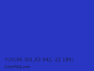 YUV 66.301,63.942,-22.189 Color is a normal blue color and the nearest color is Persian Blue #1c39bb. Hex code #2936c4 and RGB value is rgb(41,54,196). In RGB color space, this color is composed of 16% red, 21% green, 77% blue, In CMYK color space, this color is composed of 79% cyan, 72% magenta, 0% yellow , 23% black , In HSL color space, this color has a hue angle of 235° , 65% saturation and 46% lightness.