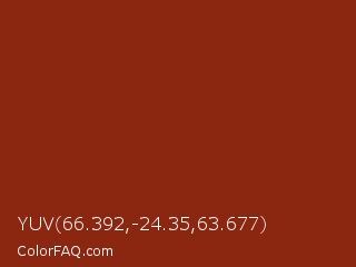 YUV 66.392,-24.35,63.677 Color is a normal red color and the nearest color is Kobe #882d17. Hex code #8b2711 and RGB value is rgb(139,39,17). In RGB color space, this color is composed of 55% red, 15% green, 7% blue, In CMYK color space, this color is composed of 0% cyan, 72% magenta, 88% yellow , 45% black , In HSL color space, this color has a hue angle of 11° , 78% saturation and 31% lightness.