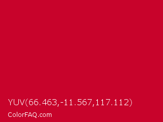 YUV 66.463,-11.567,117.112 Color is a normal red color and the nearest color is Red NCS #c40233. Hex code #c8032b and RGB value is rgb(200,3,43). In RGB color space, this color is composed of 78% red, 1% green, 17% blue, In CMYK color space, this color is composed of 0% cyan, 99% magenta, 79% yellow , 22% black , In HSL color space, this color has a hue angle of 348° , 97% saturation and 40% lightness.
