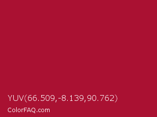 YUV 66.509,-8.139,90.762 Color is a normal red color and the nearest color is Shiraz #b20931. Hex code #aa1132 and RGB value is rgb(170,17,50). In RGB color space, this color is composed of 67% red, 7% green, 20% blue, In CMYK color space, this color is composed of 0% cyan, 90% magenta, 71% yellow , 33% black , In HSL color space, this color has a hue angle of 347° , 82% saturation and 37% lightness.