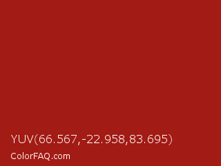 YUV 66.567,-22.958,83.695 Color is a normal red color and the nearest color is Spartan Crimson #9e1316. Hex code #a21b14 and RGB value is rgb(162,27,20). In RGB color space, this color is composed of 64% red, 11% green, 8% blue, In CMYK color space, this color is composed of 0% cyan, 83% magenta, 88% yellow , 36% black , In HSL color space, this color has a hue angle of 3° , 78% saturation and 36% lightness.