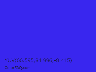 YUV 66.595,84.996,-8.415 Color is a normal indigo color and the nearest color is Palatinate Blue #273be2. Hex code #3926ef and RGB value is rgb(57,38,239). In RGB color space, this color is composed of 22% red, 15% green, 94% blue, In CMYK color space, this color is composed of 76% cyan, 84% magenta, 0% yellow , 6% black , In HSL color space, this color has a hue angle of 246° , 86% saturation and 54% lightness.