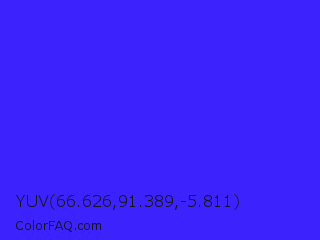 YUV 66.626,91.389,-5.811 Color is a normal indigo color and the nearest color is Han Purple #5218fa. Hex code #3c22fc and RGB value is rgb(60,34,252). In RGB color space, this color is composed of 24% red, 13% green, 99% blue, In CMYK color space, this color is composed of 76% cyan, 87% magenta, 0% yellow , 1% black , In HSL color space, this color has a hue angle of 247° , 97% saturation and 56% lightness.
