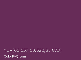 YUV 66.657,10.522,31.873 Color is a dark magenta color and the nearest color is Finn #692d54. Hex code #672c58 and RGB value is rgb(103,44,88). In RGB color space, this color is composed of 40% red, 17% green, 35% blue, In CMYK color space, this color is composed of 0% cyan, 57% magenta, 15% yellow , 60% black , In HSL color space, this color has a hue angle of 315° , 40% saturation and 29% lightness.
