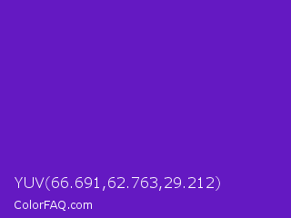 YUV 66.691,62.763,29.212 Color is a normal violet color and the nearest color is Purple Heart Crayola #652dc1. Hex code #6419c2 and RGB value is rgb(100,25,194). In RGB color space, this color is composed of 39% red, 10% green, 76% blue, In CMYK color space, this color is composed of 48% cyan, 87% magenta, 0% yellow , 24% black , In HSL color space, this color has a hue angle of 267° , 77% saturation and 43% lightness.