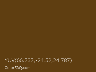 YUV 66.737,-24.52,24.787 Color is a very dark orange color and the nearest color is Pullman Brown UPS Brown #644117. Hex code #5f3e11 and RGB value is rgb(95,62,17). In RGB color space, this color is composed of 37% red, 24% green, 7% blue, In CMYK color space, this color is composed of 0% cyan, 35% magenta, 82% yellow , 63% black , In HSL color space, this color has a hue angle of 35° , 70% saturation and 22% lightness.