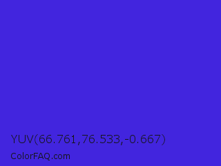 YUV 66.761,76.533,-0.667 Color is a normal indigo color and the nearest color is Interdimensional Blue #360ccc. Hex code #4225de and RGB value is rgb(66,37,222). In RGB color space, this color is composed of 26% red, 15% green, 87% blue, In CMYK color space, this color is composed of 70% cyan, 83% magenta, 0% yellow , 13% black , In HSL color space, this color has a hue angle of 249° , 74% saturation and 51% lightness.
