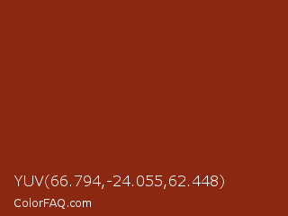 YUV 66.794,-24.055,62.448 Color is a normal red color and the nearest color is Kobe #882d17. Hex code #8a2812 and RGB value is rgb(138,40,18). In RGB color space, this color is composed of 54% red, 16% green, 7% blue, In CMYK color space, this color is composed of 0% cyan, 71% magenta, 87% yellow , 46% black , In HSL color space, this color has a hue angle of 11° , 77% saturation and 31% lightness.