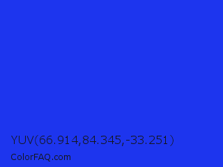 YUV 66.914,84.345,-33.251 Color is a normal blue color and the nearest color is Palatinate Blue #273be2. Hex code #1d35ee and RGB value is rgb(29,53,238). In RGB color space, this color is composed of 11% red, 21% green, 93% blue, In CMYK color space, this color is composed of 88% cyan, 78% magenta, 0% yellow , 7% black , In HSL color space, this color has a hue angle of 233° , 86% saturation and 52% lightness.