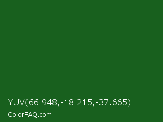 YUV 66.948,-18.215,-37.665 Color is a dark green color and the nearest color is Parsley #134f19. Hex code #18601e and RGB value is rgb(24,96,30). In RGB color space, this color is composed of 9% red, 38% green, 12% blue, In CMYK color space, this color is composed of 75% cyan, 0% magenta, 69% yellow , 62% black , In HSL color space, this color has a hue angle of 125° , 60% saturation and 24% lightness.