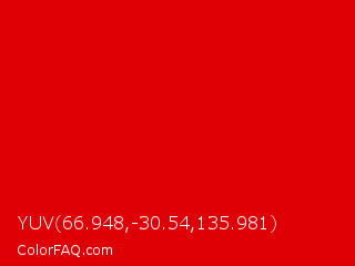 YUV 66.948,-30.54,135.981 Color is a normal red color and the nearest color is Rosso Corsa #d40000. Hex code #de0005 and RGB value is rgb(222,0,5). In RGB color space, this color is composed of 87% red, 0% green, 2% blue, In CMYK color space, this color is composed of 0% cyan, 100% magenta, 98% yellow , 13% black , In HSL color space, this color has a hue angle of 359° , 100% saturation and 44% lightness.