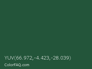 YUV 66.972,-4.423,-28.039 Color is a dark green color and the nearest color is Brunswick Green #1b4d3e. Hex code #23553a and RGB value is rgb(35,85,58). In RGB color space, this color is composed of 14% red, 33% green, 23% blue, In CMYK color space, this color is composed of 59% cyan, 0% magenta, 32% yellow , 67% black , In HSL color space, this color has a hue angle of 148° , 42% saturation and 24% lightness.
