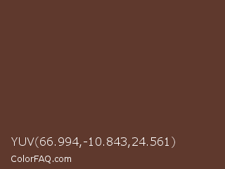 YUV 66.994,-10.843,24.561 Color is a dark red color and the nearest color is Quincy #623f2d. Hex code #5f392d and RGB value is rgb(95,57,45). In RGB color space, this color is composed of 37% red, 22% green, 18% blue, In CMYK color space, this color is composed of 0% cyan, 40% magenta, 53% yellow , 63% black , In HSL color space, this color has a hue angle of 14° , 36% saturation and 27% lightness.