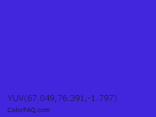 YUV 67.049,76.391,-1.797 Color is a normal indigo color and the nearest color is Interdimensional Blue #360ccc. Hex code #4126de and RGB value is rgb(65,38,222). In RGB color space, this color is composed of 25% red, 15% green, 87% blue, In CMYK color space, this color is composed of 71% cyan, 83% magenta, 0% yellow , 13% black , In HSL color space, this color has a hue angle of 249° , 74% saturation and 51% lightness.