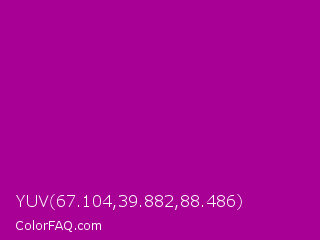 YUV 67.104,39.882,88.486 Color is a normal magenta color and the nearest color is Violet Eggplant #991199. Hex code #a80094 and RGB value is rgb(168,-0,148). In RGB color space, this color is composed of 66% red, 0% green, 58% blue, In CMYK color space, this color is composed of 0% cyan, 100% magenta, 12% yellow , 34% black , In HSL color space, this color has a hue angle of 307° , 100% saturation and 33% lightness.