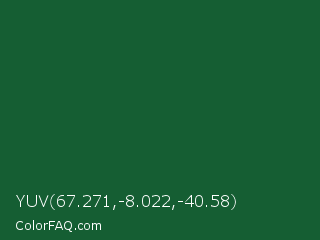 YUV 67.271,-8.022,-40.58 Color is a dark green color and the nearest color is Green Pea #1d6142. Hex code #155e33 and RGB value is rgb(21,94,51). In RGB color space, this color is composed of 8% red, 37% green, 20% blue, In CMYK color space, this color is composed of 78% cyan, 0% magenta, 46% yellow , 63% black , In HSL color space, this color has a hue angle of 145° , 63% saturation and 23% lightness.