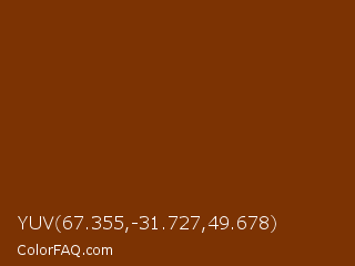 YUV 67.355,-31.727,49.678 Color is a dark orange color and the nearest color is Red Beech #7b3801. Hex code #7c3303 and RGB value is rgb(124,51,3). In RGB color space, this color is composed of 49% red, 20% green, 1% blue, In CMYK color space, this color is composed of 0% cyan, 59% magenta, 98% yellow , 51% black , In HSL color space, this color has a hue angle of 24° , 95% saturation and 25% lightness.