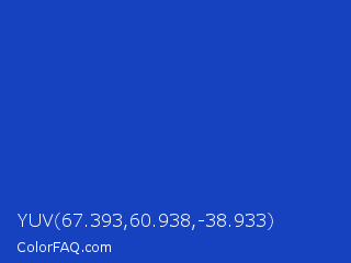 YUV 67.393,60.938,-38.933 Color is a normal blue color and the nearest color is Persian Blue #1c39bb. Hex code #1742bf and RGB value is rgb(23,66,191). In RGB color space, this color is composed of 9% red, 26% green, 75% blue, In CMYK color space, this color is composed of 88% cyan, 65% magenta, 0% yellow , 25% black , In HSL color space, this color has a hue angle of 225° , 79% saturation and 42% lightness.