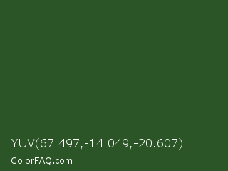 YUV 67.497,-14.049,-20.607 Color is a dark green color and the nearest color is Mughal Green #306030. Hex code #2c5527 and RGB value is rgb(44,85,39). In RGB color space, this color is composed of 17% red, 33% green, 15% blue, In CMYK color space, this color is composed of 48% cyan, 0% magenta, 54% yellow , 67% black , In HSL color space, this color has a hue angle of 113° , 37% saturation and 24% lightness.