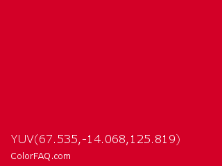 YUV 67.535,-14.068,125.819 Color is a normal red color and the nearest color is Vivid Crimson #cc0033. Hex code #d30027 and RGB value is rgb(211,-0,39). In RGB color space, this color is composed of 83% red, 0% green, 15% blue, In CMYK color space, this color is composed of 0% cyan, 100% magenta, 82% yellow , 17% black , In HSL color space, this color has a hue angle of 349° , 100% saturation and 41% lightness.