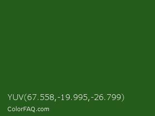 YUV 67.558,-19.995,-26.799 Color is a dark green color and the nearest color is Green House #24500f. Hex code #255b1b and RGB value is rgb(37,91,27). In RGB color space, this color is composed of 15% red, 36% green, 11% blue, In CMYK color space, this color is composed of 59% cyan, 0% magenta, 70% yellow , 64% black , In HSL color space, this color has a hue angle of 111° , 54% saturation and 23% lightness.