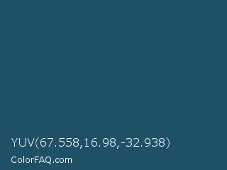 YUV 67.558,16.98,-32.938 Color is a dark blue color and the nearest color is San Juan #304b6a. Hex code #1e5066 and RGB value is rgb(30,80,102). In RGB color space, this color is composed of 12% red, 31% green, 40% blue, In CMYK color space, this color is composed of 71% cyan, 22% magenta, 0% yellow , 60% black , In HSL color space, this color has a hue angle of 198° , 55% saturation and 26% lightness.