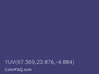 YUV 67.569,23.876,-4.884 Color is a normal indigo color and the nearest color is Minsk #3f307f. Hex code #3e3d74 and RGB value is rgb(62,61,116). In RGB color space, this color is composed of 24% red, 24% green, 45% blue, In CMYK color space, this color is composed of 47% cyan, 47% magenta, 0% yellow , 55% black , In HSL color space, this color has a hue angle of 241° , 31% saturation and 35% lightness.