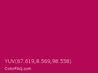 YUV 67.619,8.569,98.558 Color is a normal rose color and the nearest color is Lipstick #ab0563. Hex code #b40755 and RGB value is rgb(180,7,85). In RGB color space, this color is composed of 71% red, 3% green, 33% blue, In CMYK color space, this color is composed of 0% cyan, 96% magenta, 53% yellow , 29% black , In HSL color space, this color has a hue angle of 333° , 93% saturation and 37% lightness.