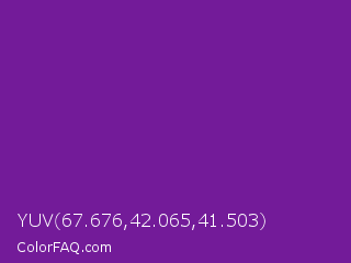 YUV 67.676,42.065,41.503 Color is a normal purple color and the nearest color is Seance #731e8f. Hex code #731b99 and RGB value is rgb(115,27,153). In RGB color space, this color is composed of 45% red, 11% green, 60% blue, In CMYK color space, this color is composed of 25% cyan, 82% magenta, 0% yellow , 40% black , In HSL color space, this color has a hue angle of 282° , 70% saturation and 35% lightness.