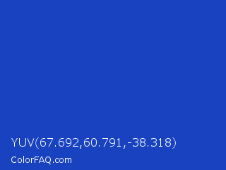 YUV 67.692,60.791,-38.318 Color is a normal blue color and the nearest color is Persian Blue #1c39bb. Hex code #1842bf and RGB value is rgb(24,66,191). In RGB color space, this color is composed of 9% red, 26% green, 75% blue, In CMYK color space, this color is composed of 87% cyan, 65% magenta, 0% yellow , 25% black , In HSL color space, this color has a hue angle of 225° , 78% saturation and 42% lightness.