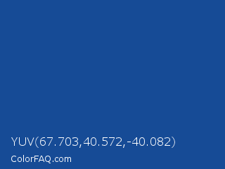 YUV 67.703,40.572,-40.082 Color is a normal blue color and the nearest color is Yale Blue #0f4d92. Hex code #164b96 and RGB value is rgb(22,75,150). In RGB color space, this color is composed of 9% red, 29% green, 59% blue, In CMYK color space, this color is composed of 85% cyan, 50% magenta, 0% yellow , 41% black , In HSL color space, this color has a hue angle of 215° , 74% saturation and 34% lightness.