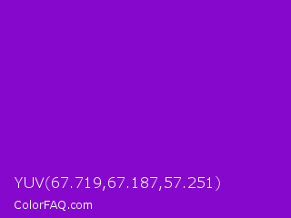 YUV 67.719,67.187,57.251 Color is a normal purple color and the nearest color is French Violet #8806ce. Hex code #8508cc and RGB value is rgb(133,8,204). In RGB color space, this color is composed of 52% red, 3% green, 80% blue, In CMYK color space, this color is composed of 35% cyan, 96% magenta, 0% yellow , 20% black , In HSL color space, this color has a hue angle of 278° , 92% saturation and 42% lightness.