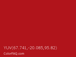 YUV 67.741,-20.085,95.82 Color is a normal red color and the nearest color is Carnelian #b31b1b. Hex code #b1141b and RGB value is rgb(177,20,27). In RGB color space, this color is composed of 69% red, 8% green, 11% blue, In CMYK color space, this color is composed of 0% cyan, 89% magenta, 85% yellow , 31% black , In HSL color space, this color has a hue angle of 357° , 80% saturation and 39% lightness.