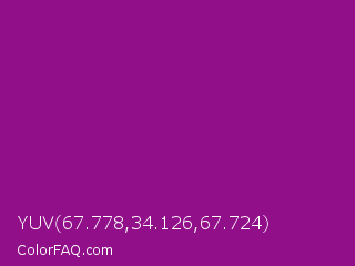 YUV 67.778,34.126,67.724 Color is a normal magenta color and the nearest color is Dark Magenta #8b008b. Hex code #910f89 and RGB value is rgb(145,15,137). In RGB color space, this color is composed of 57% red, 6% green, 54% blue, In CMYK color space, this color is composed of 0% cyan, 90% magenta, 6% yellow , 43% black , In HSL color space, this color has a hue angle of 304° , 81% saturation and 31% lightness.