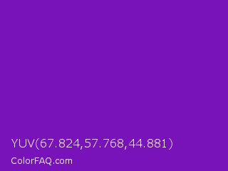 YUV 67.824,57.768,44.881 Color is a normal purple color and the nearest color is Violet RYB #8601af. Hex code #7713b9 and RGB value is rgb(119,19,185). In RGB color space, this color is composed of 47% red, 7% green, 73% blue, In CMYK color space, this color is composed of 36% cyan, 90% magenta, 0% yellow , 27% black , In HSL color space, this color has a hue angle of 276° , 81% saturation and 40% lightness.