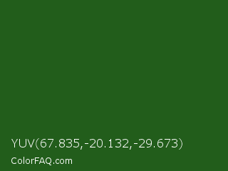 YUV 67.835,-20.132,-29.673 Color is a dark green color and the nearest color is Green House #24500f. Hex code #225d1b and RGB value is rgb(34,93,27). In RGB color space, this color is composed of 13% red, 36% green, 11% blue, In CMYK color space, this color is composed of 63% cyan, 0% magenta, 71% yellow , 64% black , In HSL color space, this color has a hue angle of 114° , 55% saturation and 24% lightness.