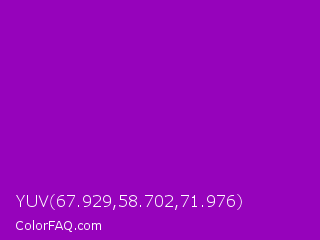 YUV 67.929,58.702,71.976 Color is a normal purple color and the nearest color is Purple Munsell #9f00c5. Hex code #9603bb and RGB value is rgb(150,3,187). In RGB color space, this color is composed of 59% red, 1% green, 73% blue, In CMYK color space, this color is composed of 20% cyan, 98% magenta, 0% yellow , 27% black , In HSL color space, this color has a hue angle of 288° , 97% saturation and 37% lightness.