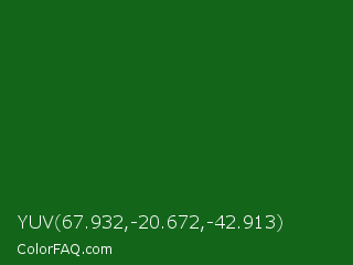 YUV 67.932,-20.672,-42.913 Color is a dark green color and the nearest color is San Felix #0b6207. Hex code #13651a and RGB value is rgb(19,101,26). In RGB color space, this color is composed of 7% red, 40% green, 10% blue, In CMYK color space, this color is composed of 81% cyan, 0% magenta, 74% yellow , 60% black , In HSL color space, this color has a hue angle of 125° , 68% saturation and 24% lightness.
