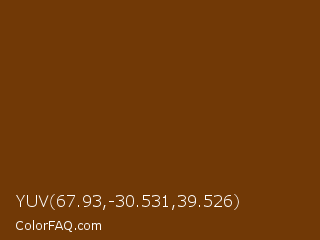 YUV 67.93,-30.531,39.526 Color is a dark orange color and the nearest color is Red Beech #7b3801. Hex code #713906 and RGB value is rgb(113,57,6). In RGB color space, this color is composed of 44% red, 22% green, 2% blue, In CMYK color space, this color is composed of 0% cyan, 50% magenta, 95% yellow , 56% black , In HSL color space, this color has a hue angle of 29° , 90% saturation and 23% lightness.