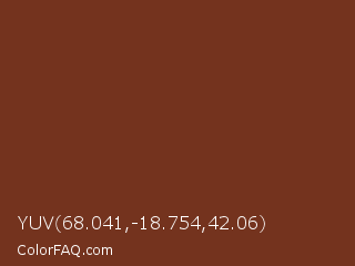 YUV 68.041,-18.754,42.06 Color is a dark color and the nearest color is Mocha #782d19. Hex code #74331e and RGB value is rgb(116,51,30). In RGB color space, this color is composed of 45% red, 20% green, 12% blue, In CMYK color space, this color is composed of 0% cyan, 56% magenta, 74% yellow , 55% black , In HSL color space, this color has a hue angle of 15° , 59% saturation and 29% lightness.