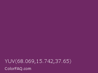 YUV 68.069,15.742,37.65 Color is a dark magenta color and the nearest color is Byzantium #702963. Hex code #6f2864 and RGB value is rgb(111,40,100). In RGB color space, this color is composed of 44% red, 16% green, 39% blue, In CMYK color space, this color is composed of 0% cyan, 64% magenta, 10% yellow , 56% black , In HSL color space, this color has a hue angle of 309° , 47% saturation and 30% lightness.