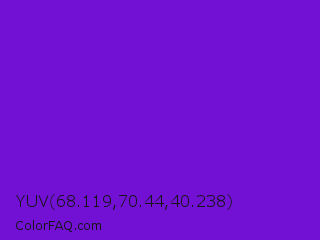 YUV 68.119,70.44,40.238 Color is a normal violet color and the nearest color is French Violet #8806ce. Hex code #7211d3 and RGB value is rgb(114,17,211). In RGB color space, this color is composed of 45% red, 7% green, 83% blue, In CMYK color space, this color is composed of 46% cyan, 92% magenta, 0% yellow , 17% black , In HSL color space, this color has a hue angle of 270° , 85% saturation and 45% lightness.